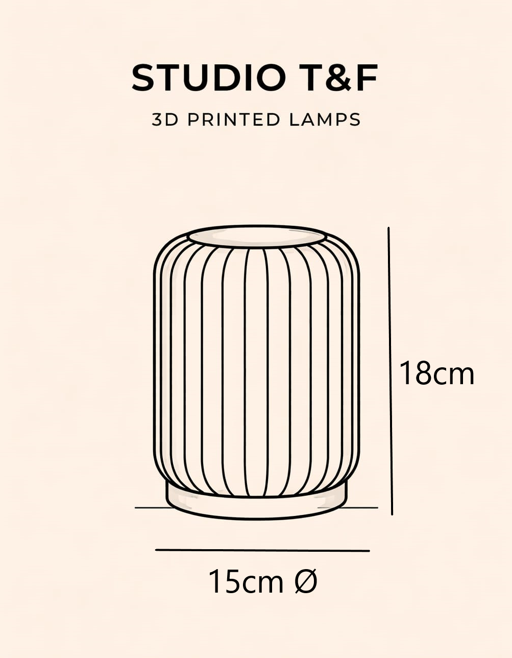 Su forma cilíndrica y su superficie texturada —impresa en 3D con un diseño ondulado— generan un efecto lumínico único: la luz se filtra y proyecta reflejos envolventes que transforman el ambiente.